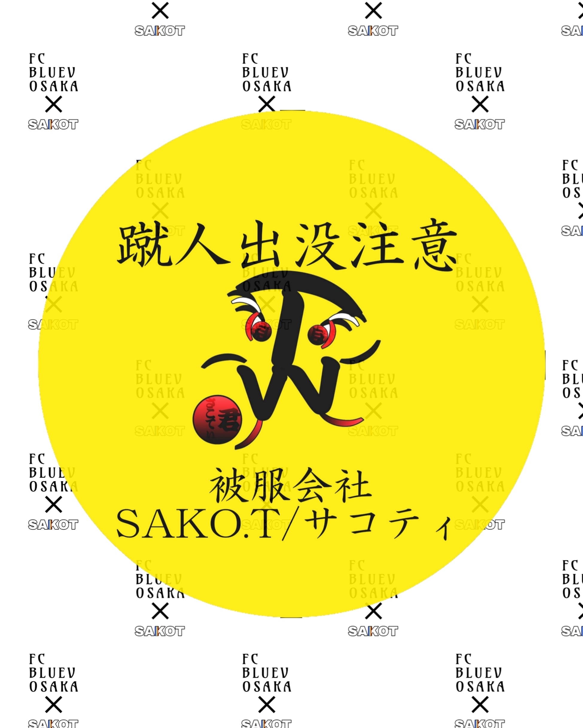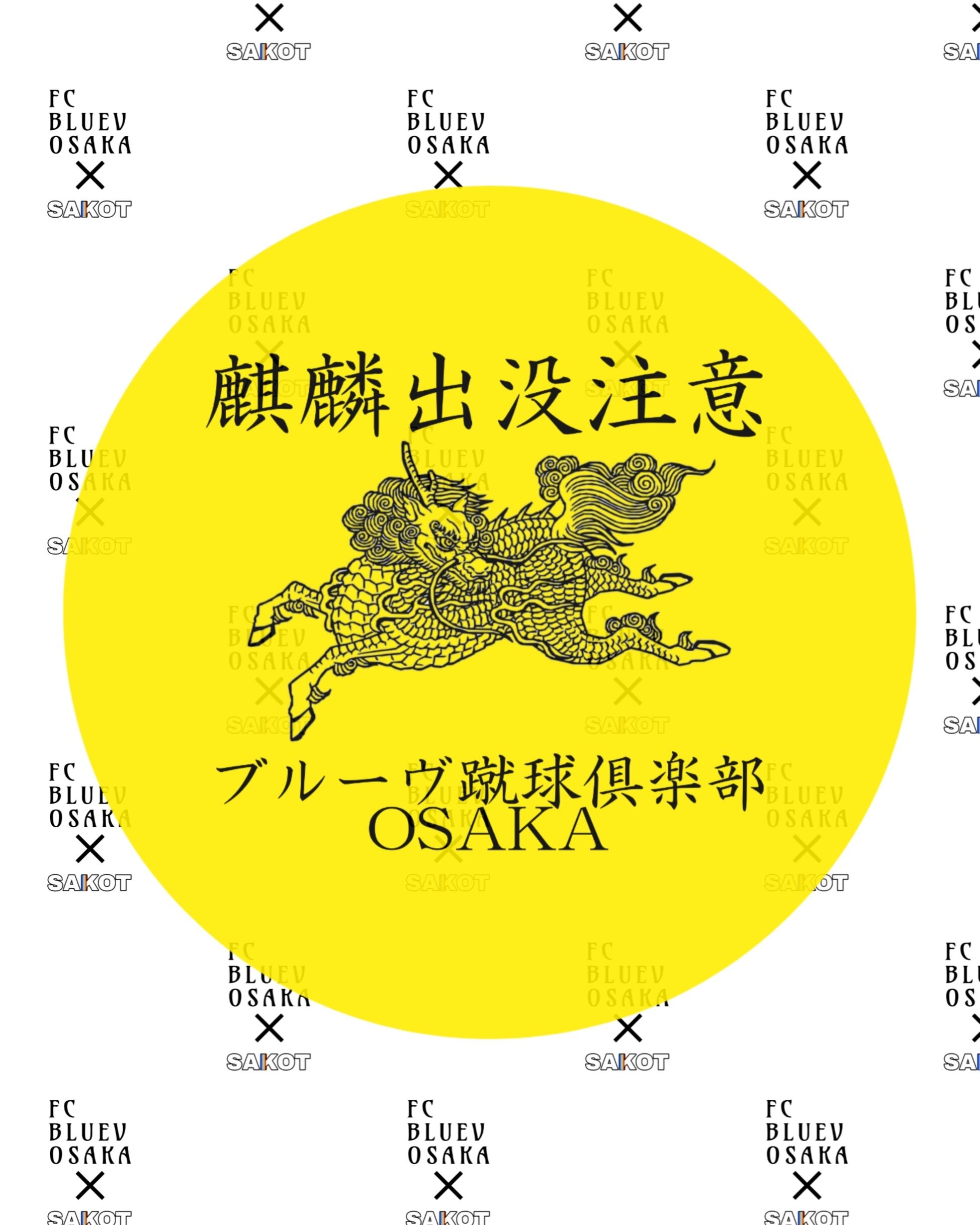 「熊出没注意」の看板からインスピレーションを受け、FC BLUEV大阪の象徴「麒麟」とSAKO.T/サコティのマスコットキャラクター「サコティ君」を中心に配置しインパクトのある一品。