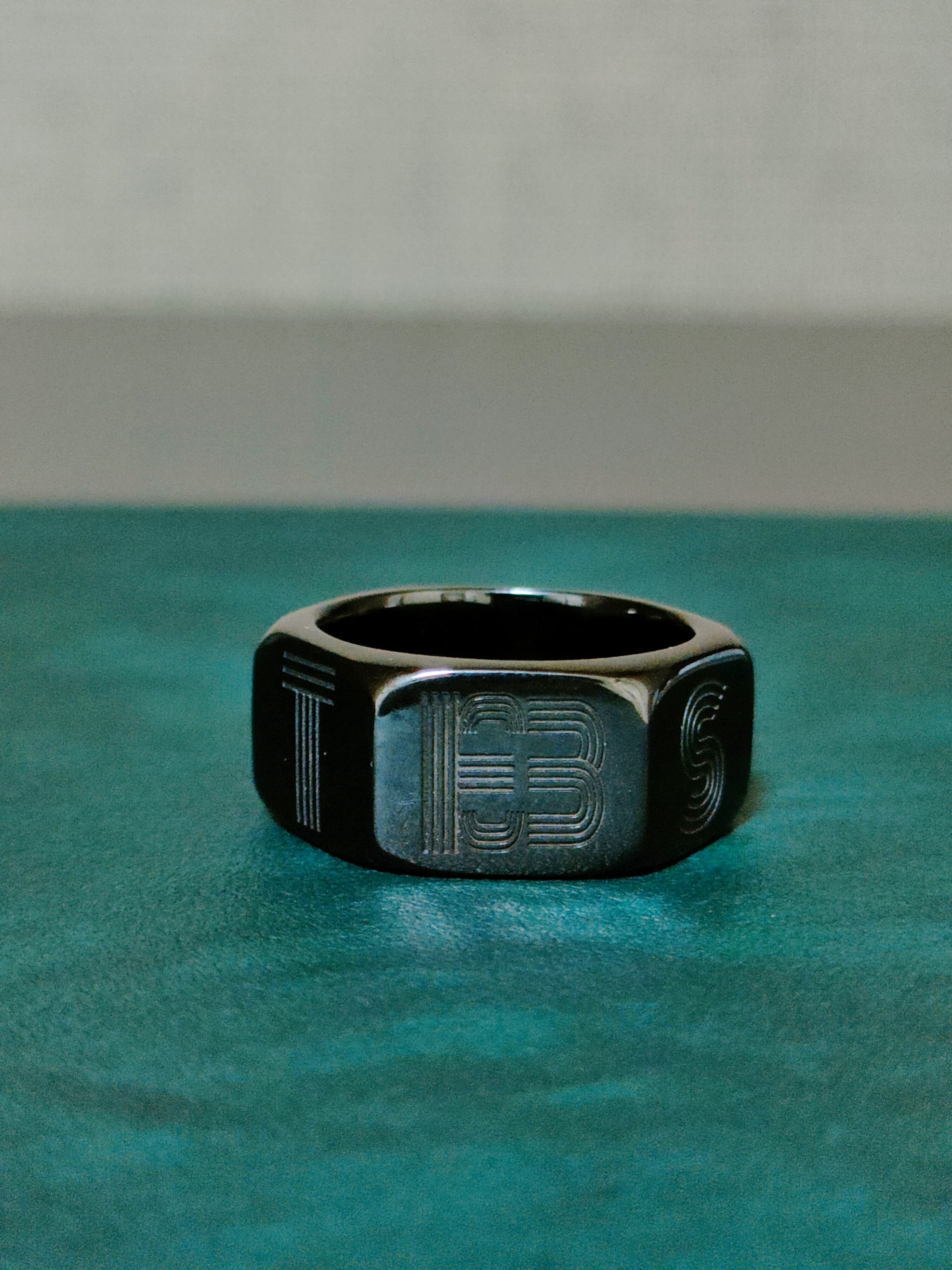 六角形のシェイプの各面にはSAKO.T/サコティを象徴するロゴをはじめフォントのデザインを施し、オリジナリティが溢れるリング。